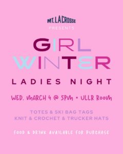 Join us for knitting, crocheting, tote bags & trucker hats! Specialty cocktails & charcuterie cups available for purchase. Bring your gals & enjoy a night of fun, laughter & crafts!
